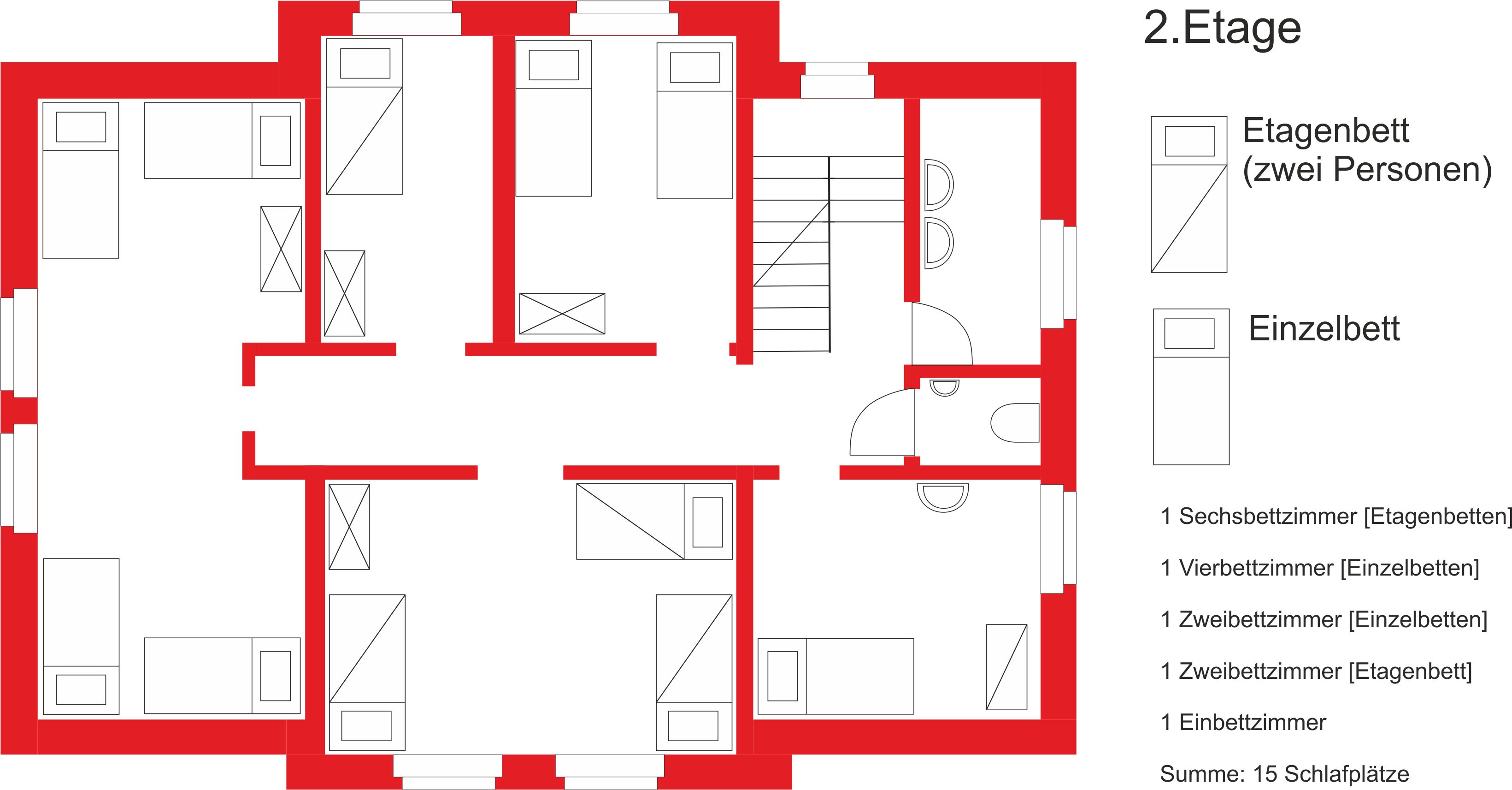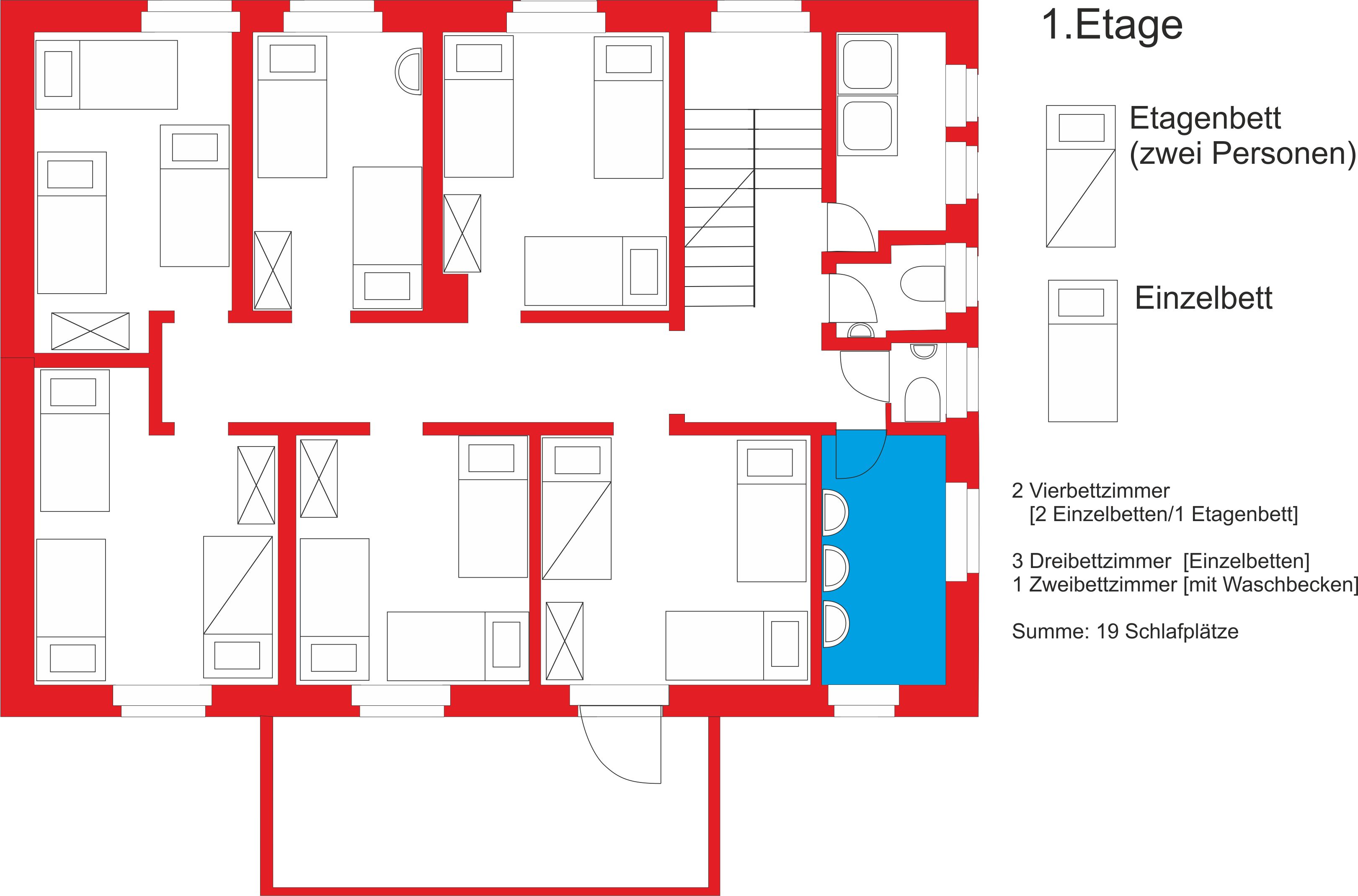 Die Schlafräume befinden sich in der 1. und 2. Etage des Hauses. Insgesamt 34 Betten - Einzel- oder Etagenbetten bieten ihenn hier eine Schlafmöglichkeit. In gemütlicher Umgebung lässt es sich hier gut ausruhen. Die Zimmer haben unterschiedliche Bettenzahlen. In der 1. Schlafetage befinden sich 19 Schlafplätze: 2 Vierbettzimmer (2 Einzelbetten / 1 Etagenbett) 3 Dreibettzimmer (Einzelbetten). 1 Zweibettzimmer (mit Waschbecken). In der 2.Etage befinden sich 15 Schlafplätze: 1 Sechsbettzimmer (3 Etagenbetten) 1 Vierbettzimmer (4 Einzelbetten) 2 Zweibettzimmer 1 Einzelzimmer Die Grundrisspläne mit einer Bettenplanskizze werden ihnen bei einer Buchung einer Freizeit zur Verfügung gestellt. |